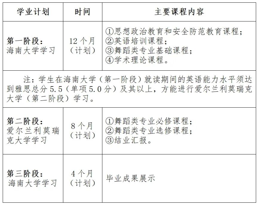 培养方式:“1+1”培养模式。海南大学学习时间12个月(计划)、爱尔兰利莫瑞克大学学习时间8个月(计划)、海南大学学习时间4个月(计划)。