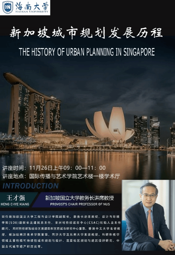 邀请,新加坡国立大学教务长讲席教授、新加坡南洋美术学院董事、亚洲可持续城市中心创始人及主任顾问王才强(HENG CHYE KIANG)教授,在艺术楼学术厅开展以 “新加坡城市规划发展历程”为主题的学术讲座。
