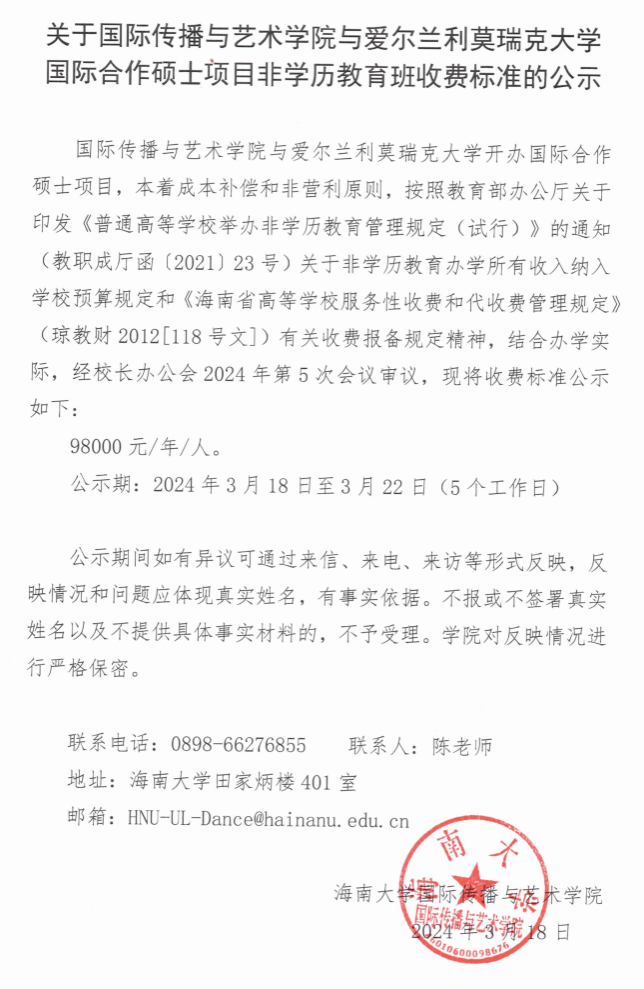 关于澳洲幸运8 与爱尔兰利莫瑞克大学国际合作硕士项目非学历教育班收费标准的公示
