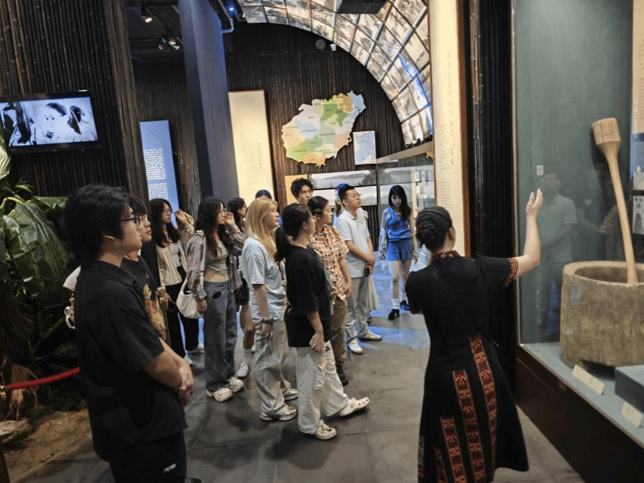 第二天,同学们走进了五指山市,通过对海南省民族博物馆(五指山市)的学习,较为深入地了解了黎族人民的基本分布情况、生产生活状况及文化信仰等。在民族博物馆调研学习过程中,元志东老师既从四大板块的内容上进行了分析,还从展品空间布置、应用场景设计等方面对同学们进行了指导。之后,同学们又在水满乡参观了莺哥景红茶园山庄,观摩学习了当地独具特色的红茶文化。