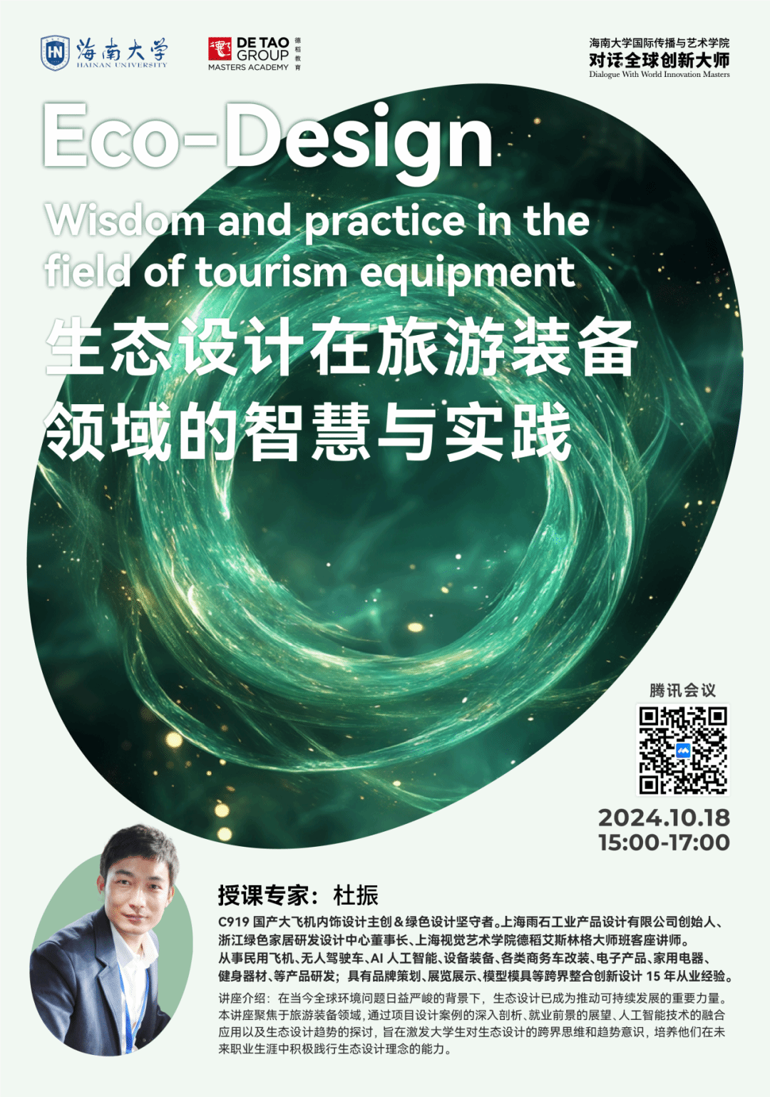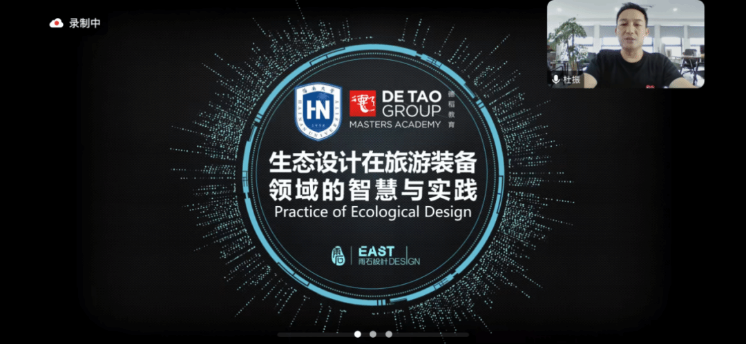 2024“对话全球创新大师讲座”《生态设计在旅游装备领域的智慧与实践》在线上举行,由上海雨石工业产品设计有限公司创始人杜振主讲,设计系专业教师方星星博士担任学术主持,线上线下近百名师生同时参与。