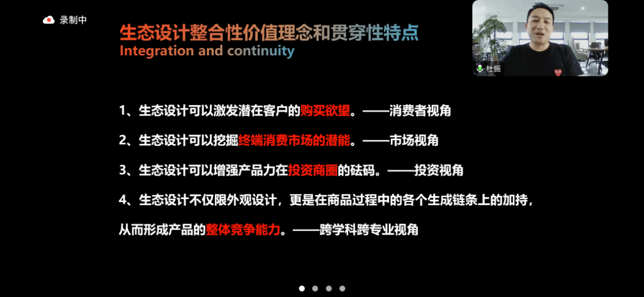 在当今全球环境问题日益严峻的背景下,生态设计已成为推动可持续发展的重要力量。在此次讲座中,杜振老师从生态设计的泛理解开始,解释当下对于生态设计的不同理解,并提出了生态设计整合性价值理念和贯穿性特点,从不同视角进一步强化同学们对生态设计的理解。