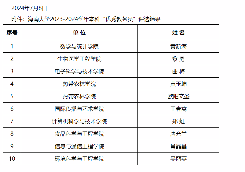近日,学校教务处发布《海南大学2023-2024学年本科“优秀教务员”评选结果公示》,澳洲幸运8 王春嵩老师榜上有名,获得表彰。