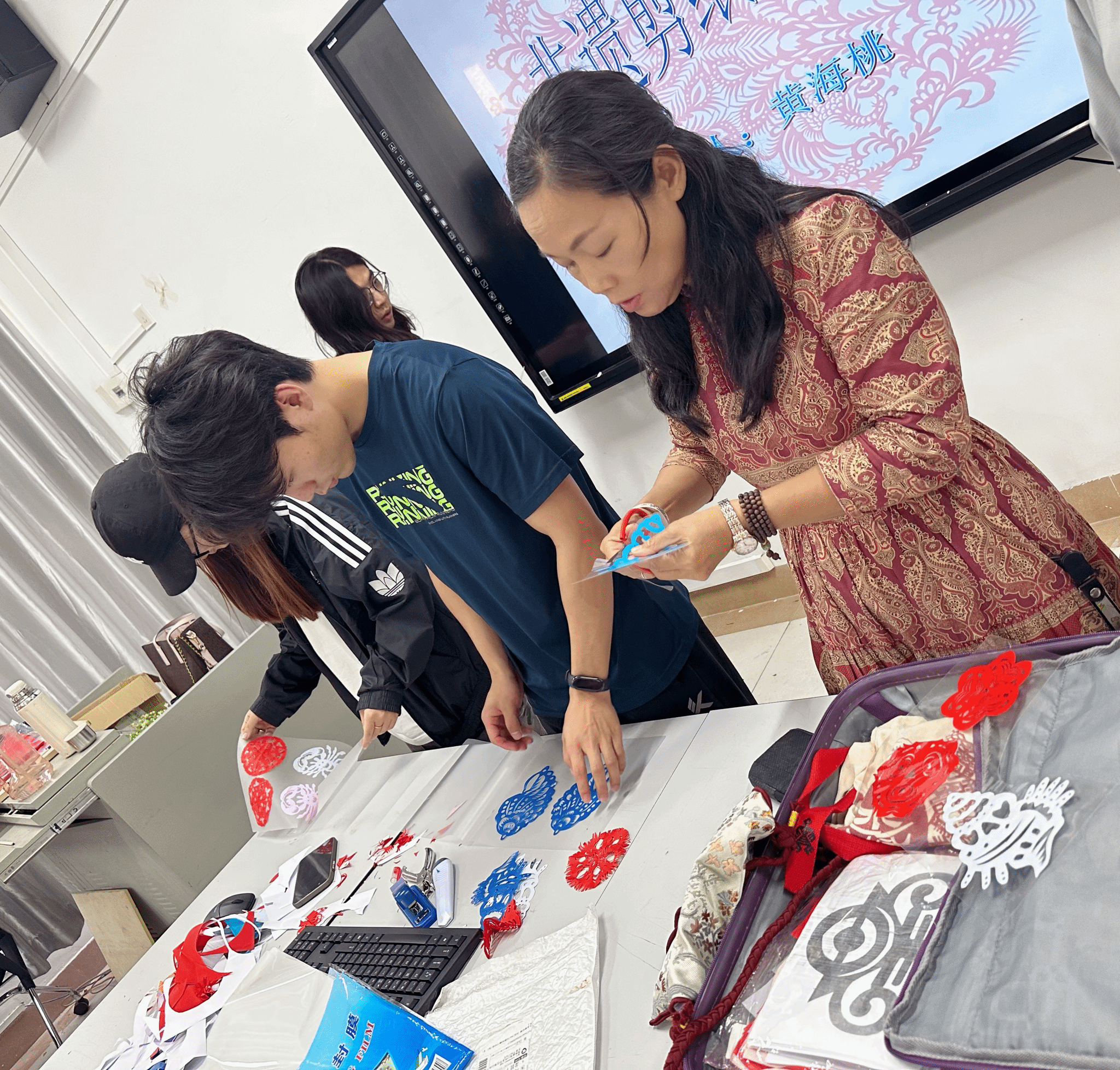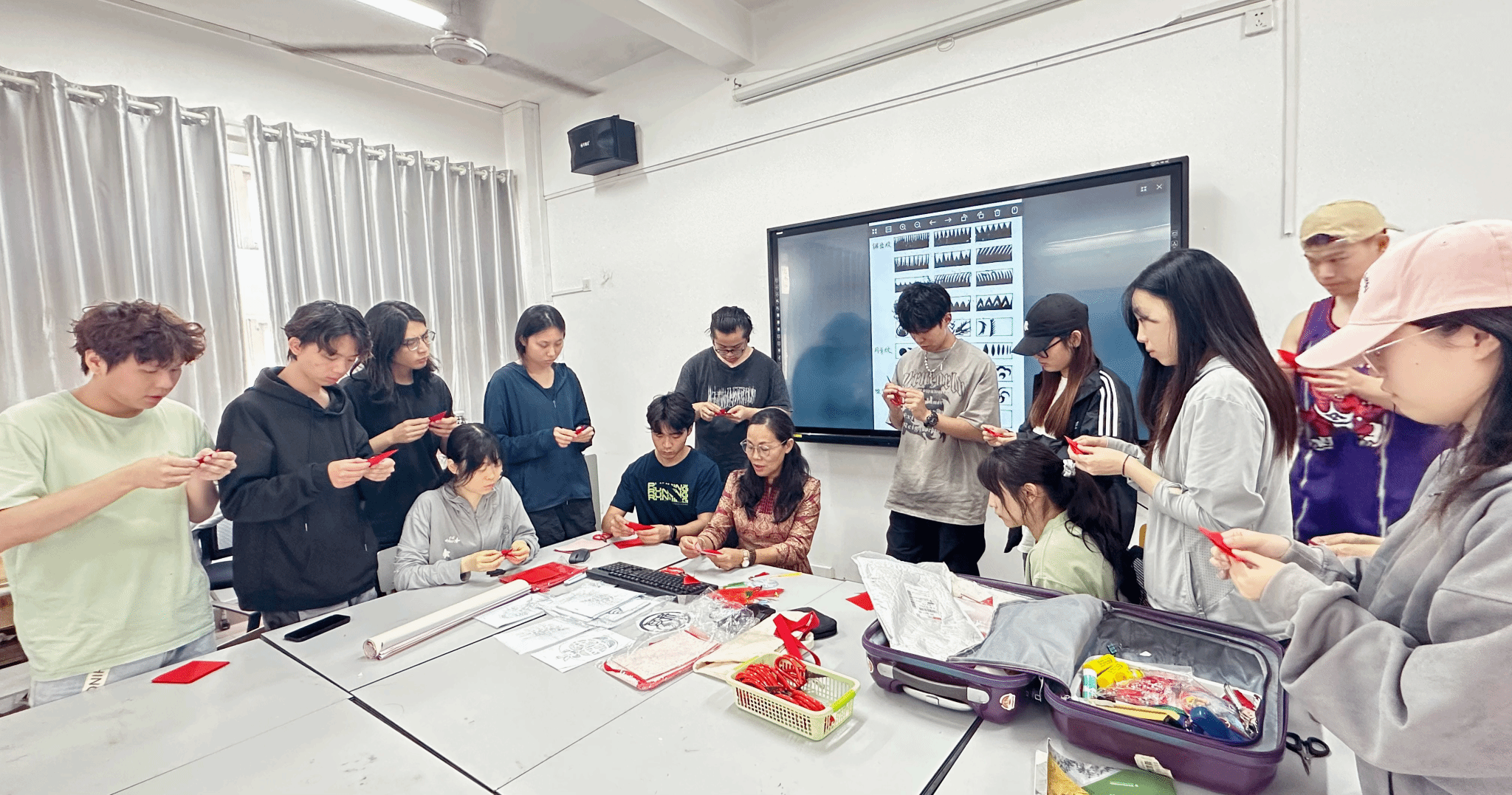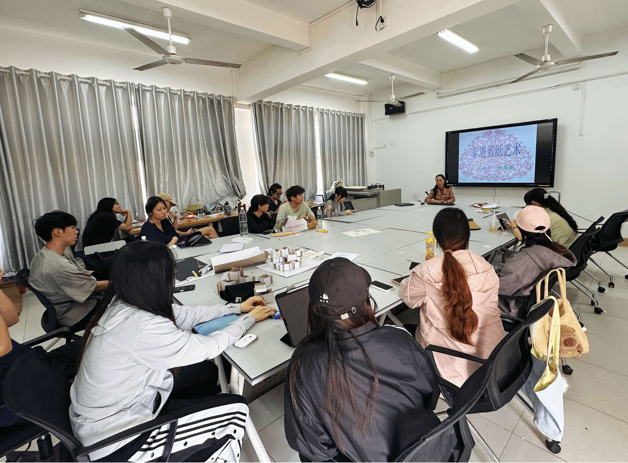 设计系大三课程—《旅游产品设计与制作》的课堂,与课程主讲教师张哲共同探索了剪纸艺术与海南文旅设计的融合路径。课程以“非遗活化+设计创新”为核心,通过理论讲授、技艺示范与创作实践,引导学生挖掘剪纸语言的地域表达潜力,现场气氛热烈。