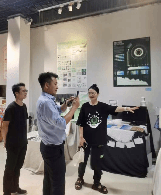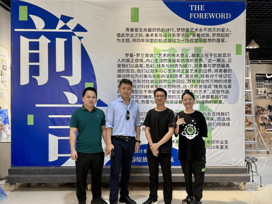 2025届设计系本科毕业展。副院长元志东、实验室与设备管理中心孙焱老师、综合办于东平老师、设计系方星星老师陪同参观并讲解。