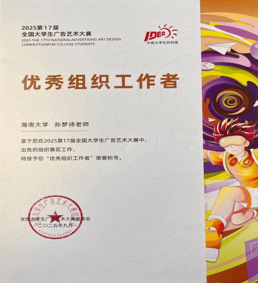 教师、大广赛海南赛区组委会秘书处孙梦诗,因卓越的组织协调能力被授予2025年度“优秀组织工作者”称号;澳洲幸运8