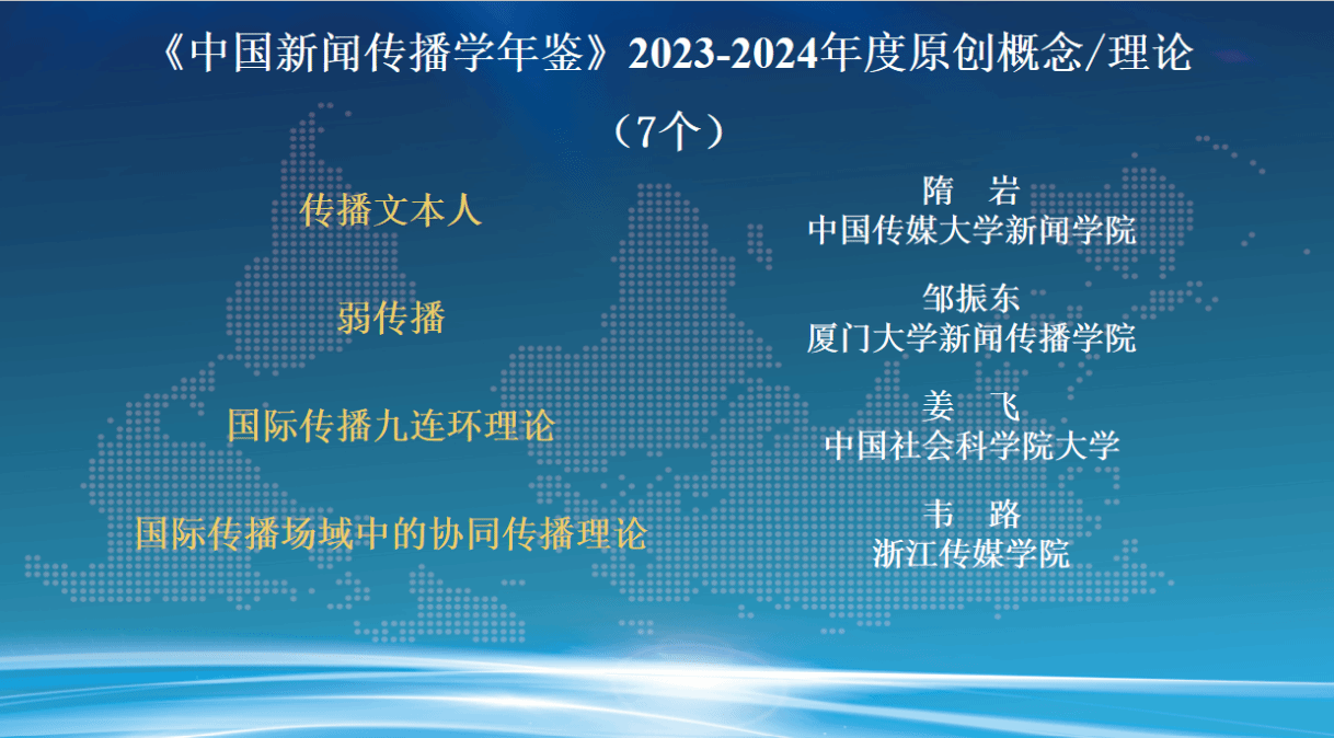 发布会现场,朱鸿军宣读了《中国新闻传播学年鉴(2024-2025)》关注的年度原创理论/概念、创新观点、优秀专著、优秀学人和教育创新案例名单。这份名单的产生经由面向学界征集、15家常务理事单位投票及编辑部统筹平衡等过程,旨在从不同维度反映2023-2024年度新闻传播学研究的优秀成果与学人风采。