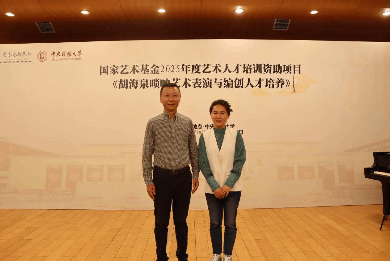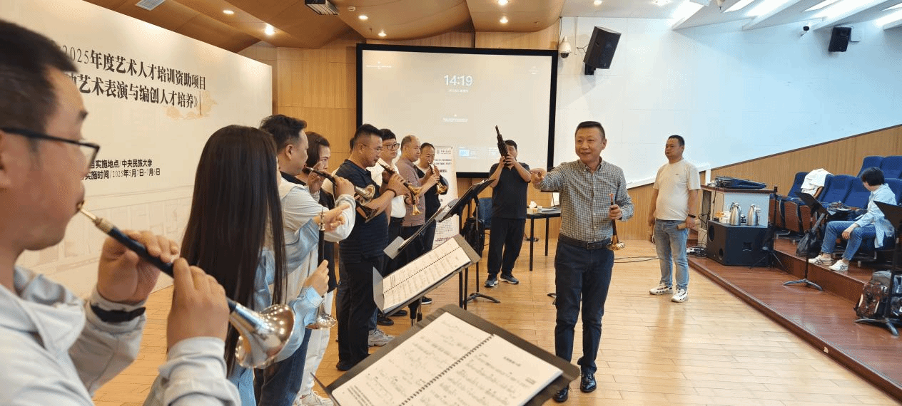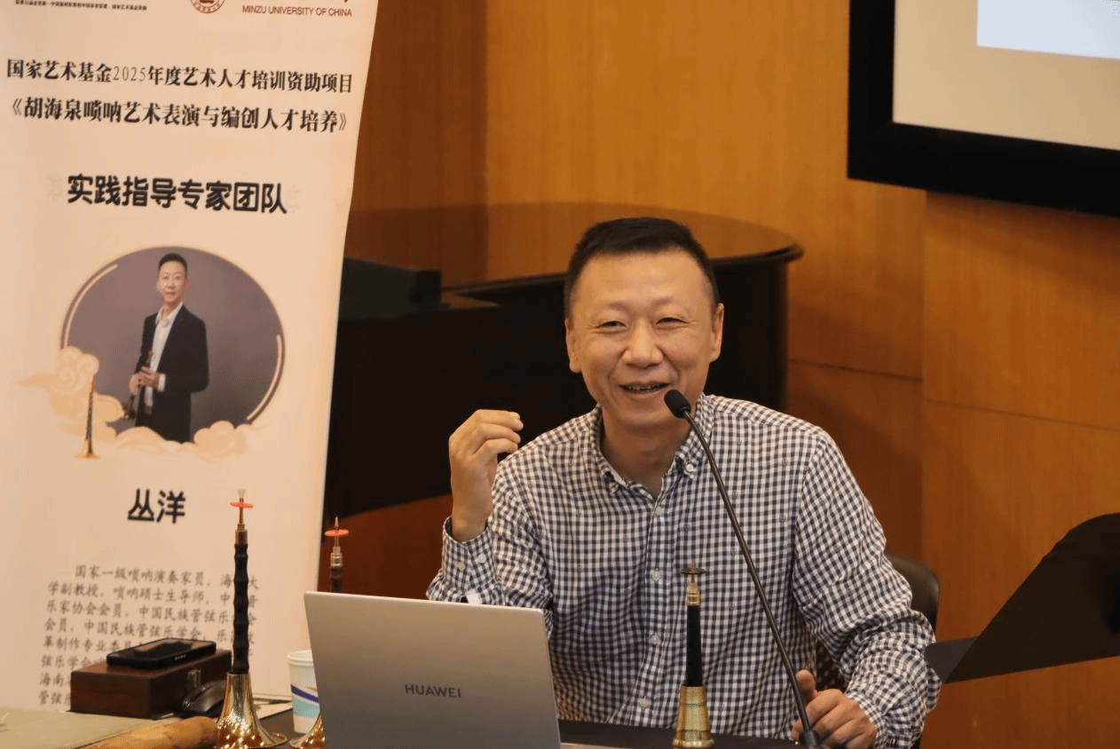 音乐系丛洋副教授,受中央民族大学音乐学院胡美玲老师之邀,出席国家艺术基金2025年度艺术人才培训资助项目活动——《胡海泉唢呐艺术表演与编创人才培养》,为全国各省40多名优秀学员进行唢呐专家授课。