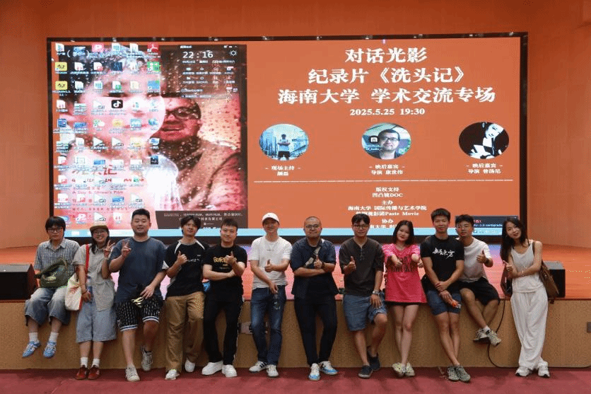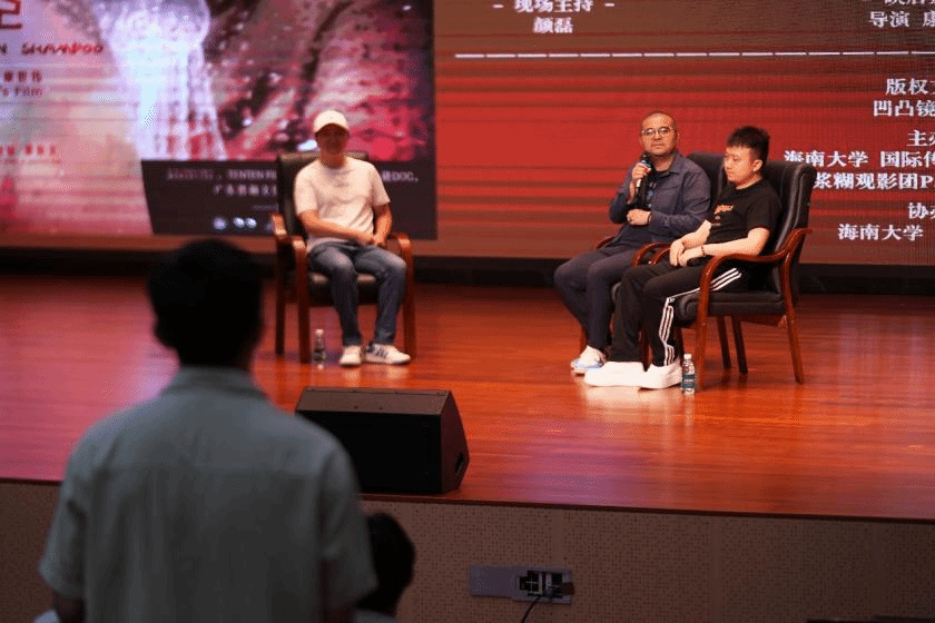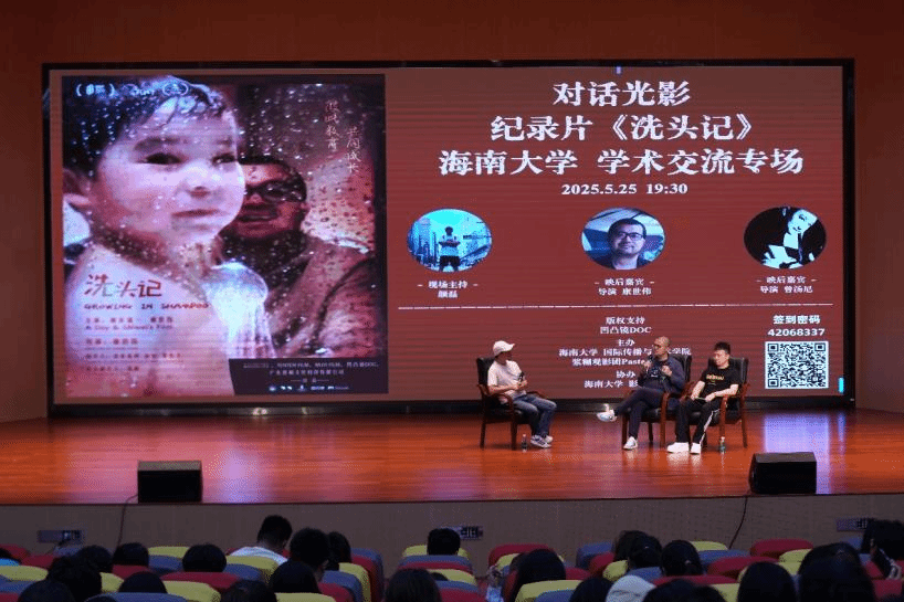 映后学术交流会由海南大学戏剧影视文学系副教授颜磊主持,《洗头记》导演康世伟与知名电影创作者曾汤尼博士亲临现场与观众交流对话。现场气氛热烈,观众提问涉及纪实影像创作、“私影像”叙事策略、亲子情感表达等诸多议题。