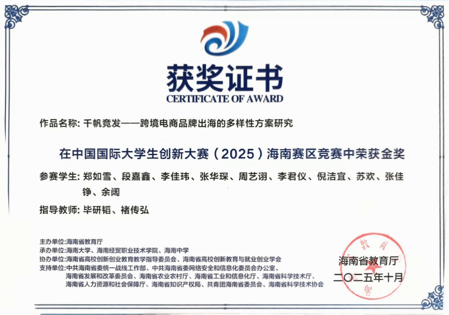 近日,中国国际大学生创新大赛(2025)海南赛区获奖名单公布,澳洲幸运8 传播学系2023级本科生郑如雪带领的团队,凭借作品《千帆竞发——跨境电商品牌出海多样性方案研究》荣获金奖,该项目指导老师毕研韬、褚传弘被评为“优秀指导教师”。