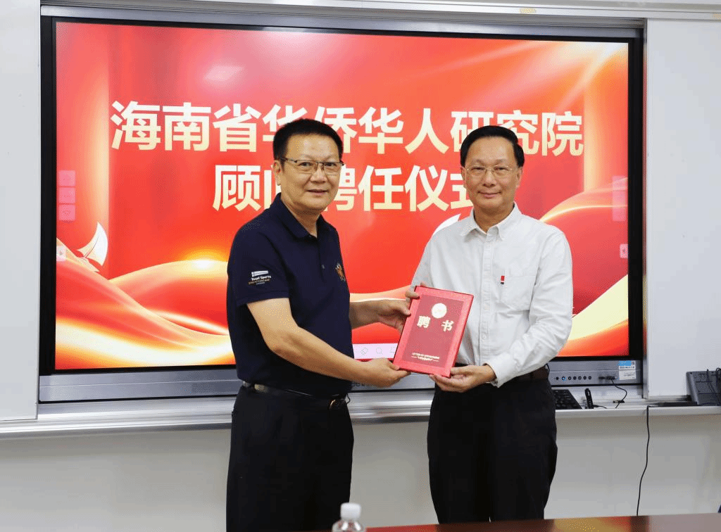 4月13日,海南省华侨华人研究院顾问聘任仪式在田家炳楼102会议室举行,聘任全国归国华侨先进个人、海南中藤科技股份有限公司董事长吴少宏为研究院顾问,海南大学党委书记符宣国为吴少宏颁发聘书。