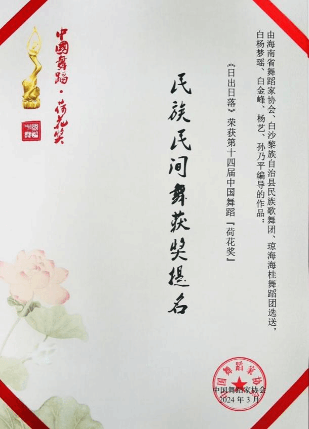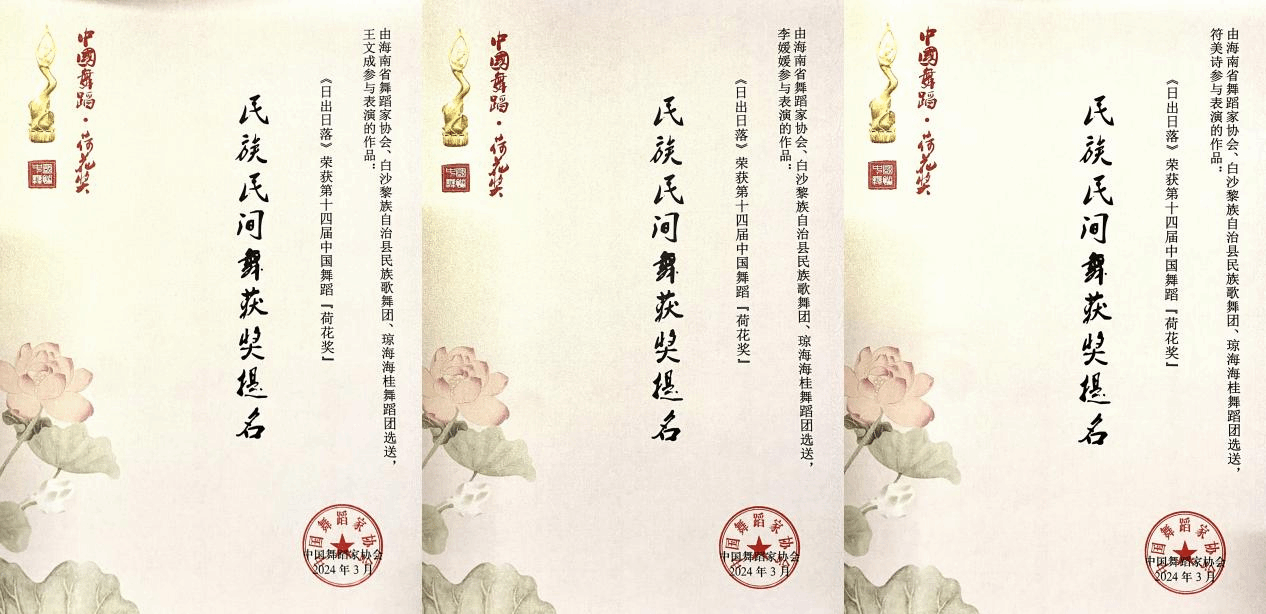 师生团队编创表演的舞蹈作品《日出日落》,荣获第十四届中国舞蹈“荷花奖”民族民间舞提名奖,是本届“荷花奖”民族民间舞评奖终评中唯一一支来自海南的黎族舞蹈。