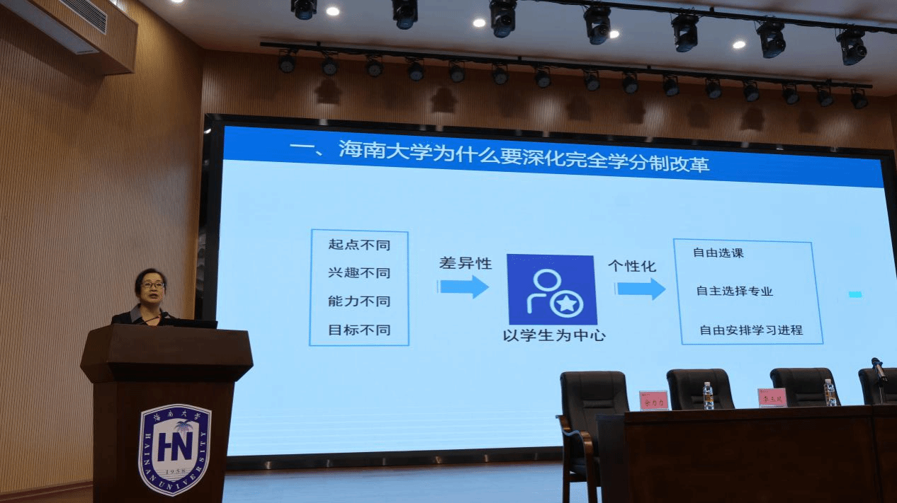 大会第二阶段,学院邀请海南大学教务处李玉凤副处长和余力力老师为全体教职工深入解读完全学分制改革政策。李玉凤副处长以“以实现学生自主选择专业为目标,构建个性化人才培养体系”为主题,从“海南大学为什么要深化完全学分制改革”“海南大学完全学分制改革进展”“海南大学深化完全学分制改革政策及应用场景”三方面对深化完全学分制改革政策做出了全面、详细地讲解,指导教师们应当如何正确指引同学们进行课程选择及学分修读。