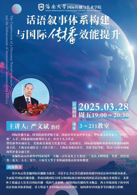 举办主题为《话语叙事体系构建与国际传播效能提升》的讲座,由新华社原副社长严文斌主讲,郑立波院长主持。